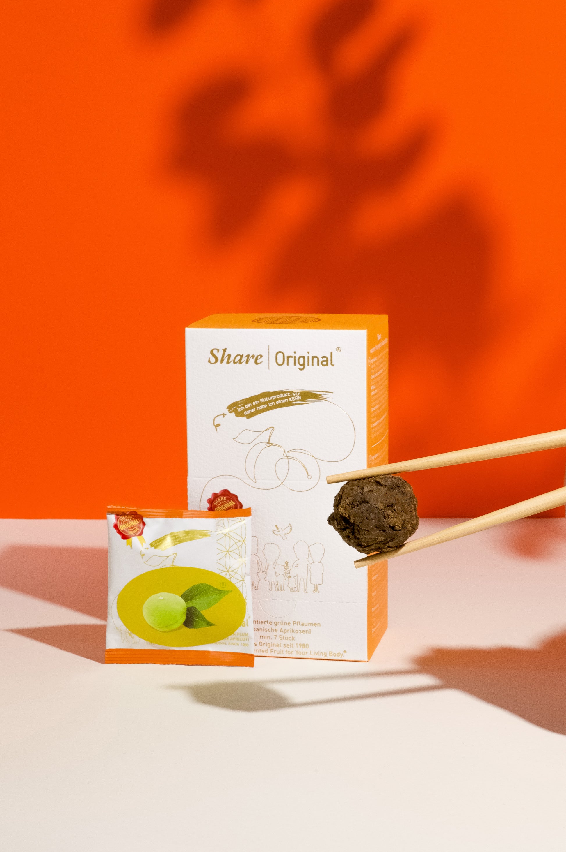 Share Original er japönsk apríkósa sem er handtínd af bændum á svæðum í Japan, ávöxturinn er svo settur í viðartunnur og látinn gerjast í 30 mánuði, að lokum er svo ávextinum velt uppúr jurtablöndu sem að inniheldur gulrótasafa, rauðbeður, aloe vera, trönuber og aðrar jurtir.
